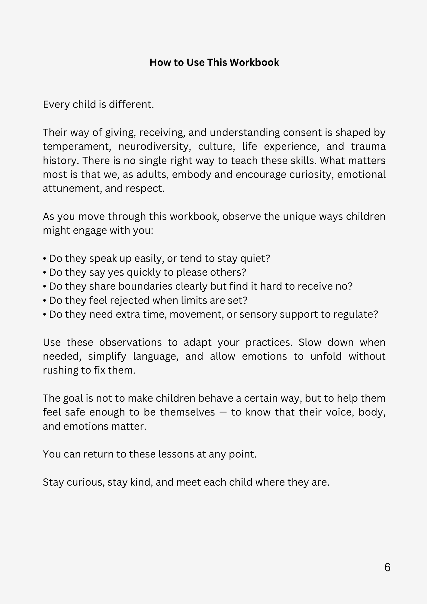 This workbook offers reflective prompts and practical activities to help adults teach consent in everyday moments — through play, empathy, and embodied communication.